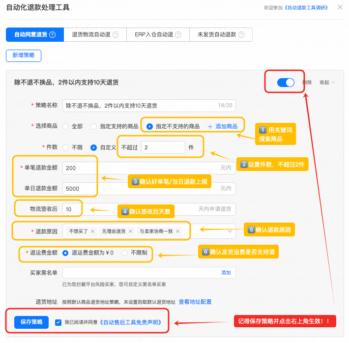 - 控制风险:限制退货件数、设置签收后X天内才可退