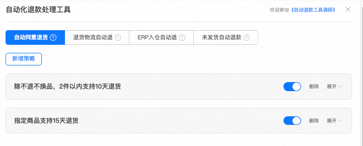 - 登录【商家后台】→【退货退款管理】→【自动退款工具设置】