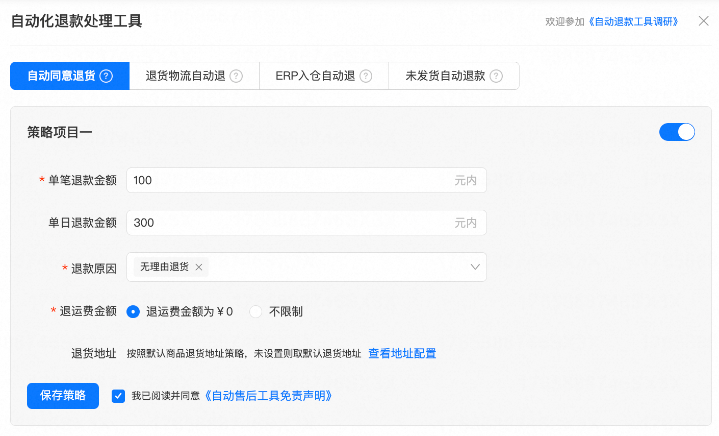 - 登录【商家后台】→【退货退款管理】→【自动退款工具设置】