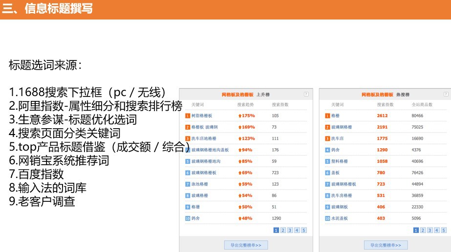 我们可以看一下编写标题的流程,通过阿里指数,我们获得相关词汇。标题编好之后,我们要读一读,组合是否流畅。遵循标题原则:
