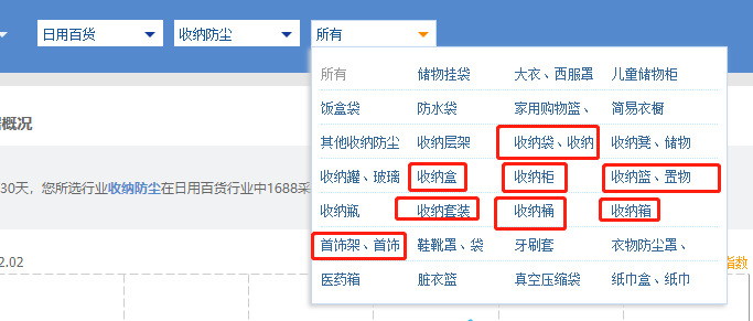 第一步:使用“数据化运营系统”的软件导出上述各个类目的1688采购指数,利用数据建模,自动运算收纳防尘各行业类目的容量。